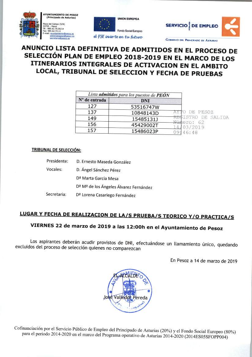 Para consultar la lista definitiva de admitiddos, el tribunal de seleccion y la fecha de la/s pruebas pulsar aqui