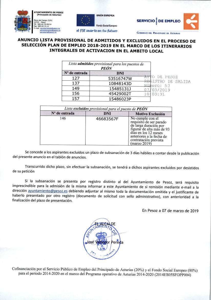 07/03/2019LISTADO PROVISIONAL ADMITIDOS/EXCLUIDOS PLAN EMPLEO 2018-2019